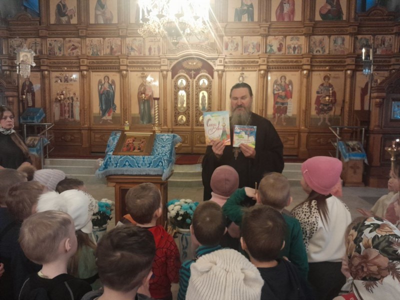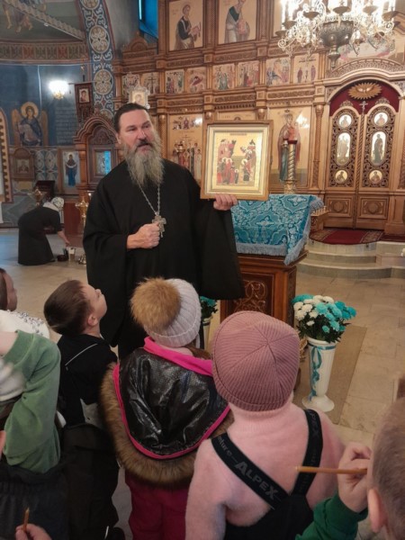 Ребят  сердечно приветствовали настоятель протоиерей Александр Панзин и матушка Мария. Батюшка провел детей по храму, рассказал о его устройстве и назначении,  поведал детям историю праздника Введения Богородицы в храм, доступно объяснил значение православных традиций и ответил на многочисленные вопросы юных гостей.
