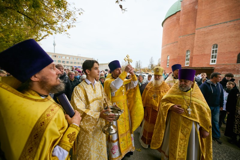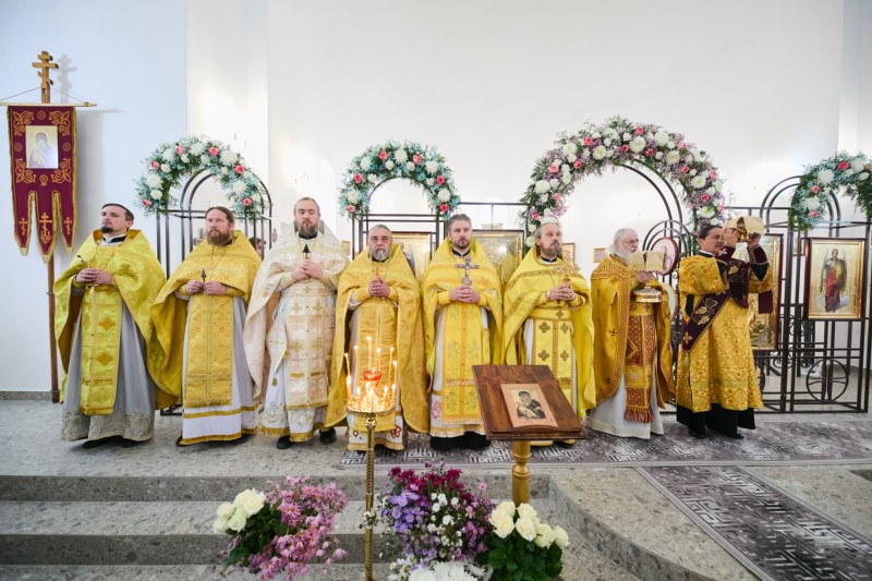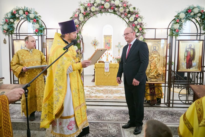 Затем к собравшимся обратился настоятель храма протоиерей Димитрий Нестеренко. Отец настоятель поздравил всех с престольным праздником, поблагодарил собравшихся за участие в подготовке храма к открытию и престольному празднику и вручил Благодарственные письма благодетелям. После этого настоятель пригласил всех гостей и прихожан на праздничную трапезу.