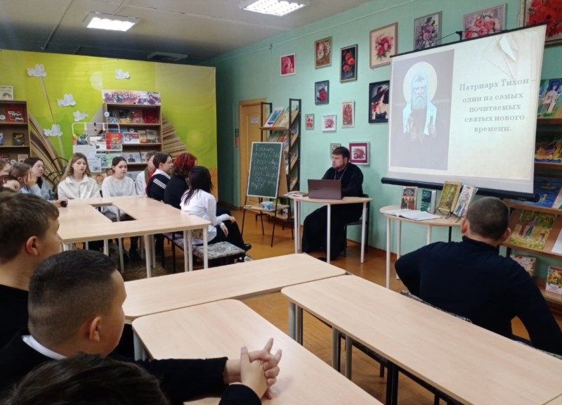 Иерей Сергий Верзилов настоятель храма Святых апостолов Петра и Павла рассказал о жизни святителя Тихона и его подвиге в годы гонений. Прочитали отрывок из книги Владимира Крупина «Русские святые».