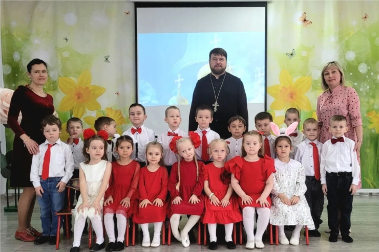 В старшей группе «Лесная полянка» детского сада №34 «Крепыш» города Новочебоксарска прошло развлечение, посвящённое Пасхе. Дети познакомились с историей и традициями праздника, узнали, почему красят яйца, и поделились семейными обычаями.На празднике присутствовал настоятель храма Ксении Петербургской иерей Андрей Архипов. Отец Андрей поздравил ребят со Светлым Христовым Воскресением, пожелал им расти добрыми, послушными и милосердными, хранить в сердце веру и радость о Воскресшем Спасителе, а также всегда радовать своих родителей любовью и добрыми делами.Вместе с Пасхальным Зайчиком дети играли в старинные игры:- «Чьё яйцо дольше прокрутится»;- эстафета «Пронеси яйцо в ложке»;- «Горка» — катание яиц с горки;- командная игра «Птичка в клетке»;- музыкальная игра «Жаворонок» на развитие слуха и ритма.Ребята водили хоровод под народную музыку, пели весенние и пасхальные песни. Завершился праздник обменом сувенирами и сладкими угощениями.Такие мероприятия помогают детям приобщиться к православной культуре, почувствовать радость общения и сохранить светлые традиции праздника. Детский сад и родители выражают искреннюю благодарность отцу Андрею за тёплые слова, внимание и поддержку.