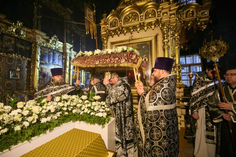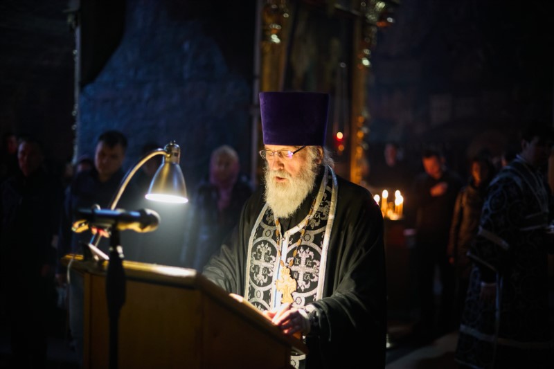 По завершении крестного хода перед Плащаницей были прочитаны пророчество о воскресении из книги пророка Иезекииля, чтение зачал Апостола и Евангелия.