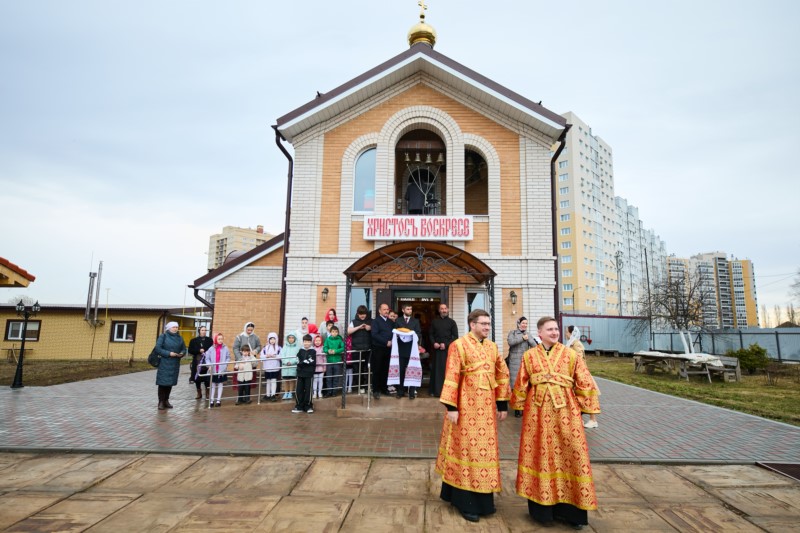 По заамвонной молитве был совершен Пасхальный Крестный ход вокруг храма с пением пасхальных ирмосов и чтения Воскресного зачала Евангелия.