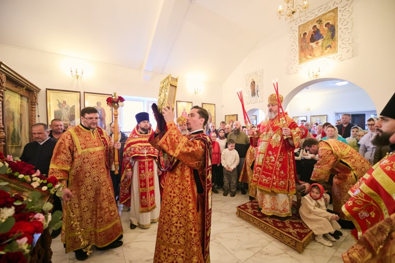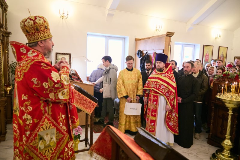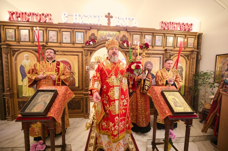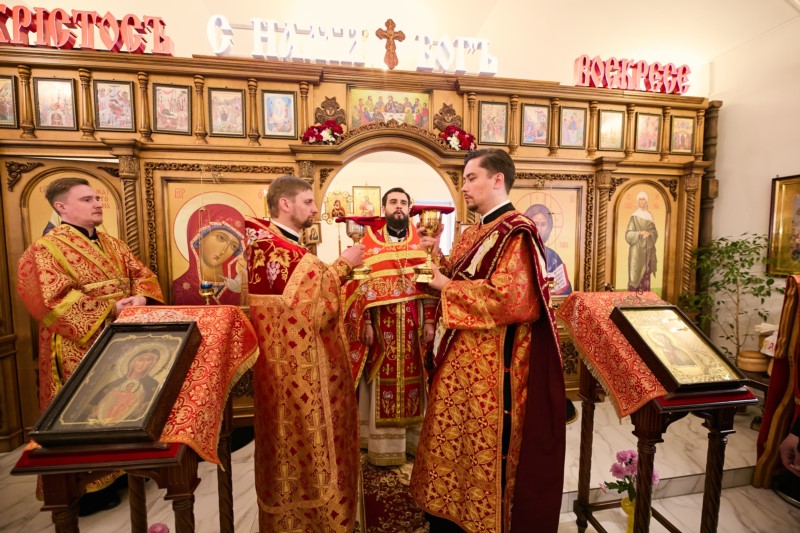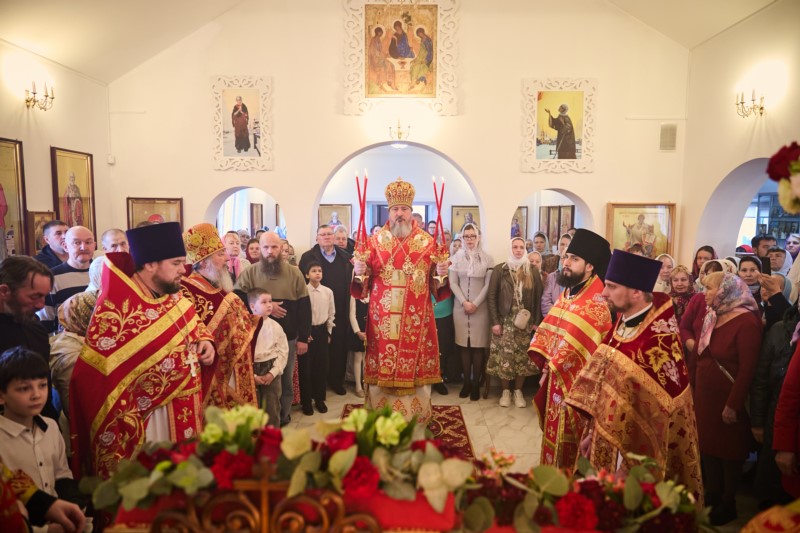 По окончании Литургии настоятель храма иерей Андрей Архипов с Пасхальным приветствием Христос Воскресе поздравил митрополита Савватия светлым праздником Пасхи Христовой.