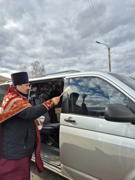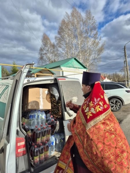 Перед отправкой груза, настоятель храма Воздвижения Креста Господня села Красные Четаи протоиерей Максим Зарубин совершил молебное пение и покропив освященной водой, благословил молодых волонтёров, которые на двух машинах отвезут груз для наших земляков, находящихся на позициях в ДНР.