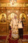 По окончании Литургии настоятель обители от лица братий монастыря приветсвовал Владыку митрополита с праздником и приподнес заздравную просфору и корзину цветов.