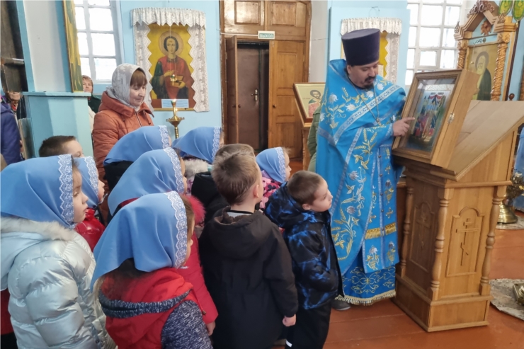 Воспитанников МАДОУ "Детский сад "Солнышко" встретил приветливо настоятель протоиерей Максим Зарубин, поведавший об истории праздника, о Деве Марии, в младенчестве приведённой в храм на воспитание. Ребята завороженно слушали рассказ, впитывая каждое слово. Затем, под руководством взрослых, дети поставили свечи у иконы Пресвятой Богородицы, вознося свои молитвы, полученные в дар от батюшки.