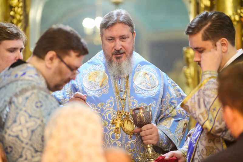 Его Высокопреосвященству сослужили ключарь кафедрального собора протоиерей Вениамин Пегасов и клирик храма иерей Александр Михайлов. Диаконский чин возглавил диакон Евгений Поляков.
