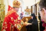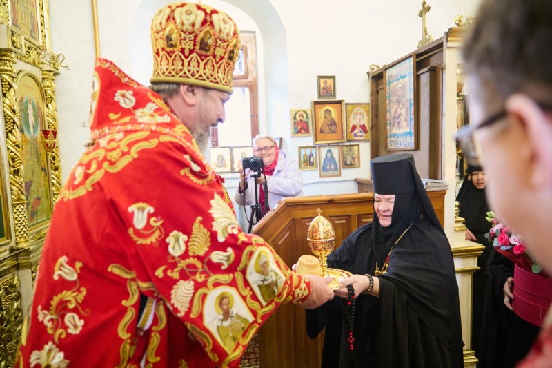 В завершении богослужения митроплита Савватия приветствовала настоятельница монастыря игумения Сергия. Матушка  преподнесла Его Высокопреосвященству Пасхальное яйцо и цветы.