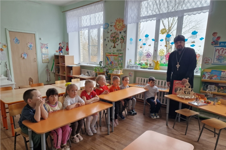 Настоятель храма Покрова Божией Матери села Калинино протоиерей Сергий Моряков посетил детский сад «Светлячок», где встретился с детьми, рассказал им о празднике Пасхи и подарил пасхальные подарки.