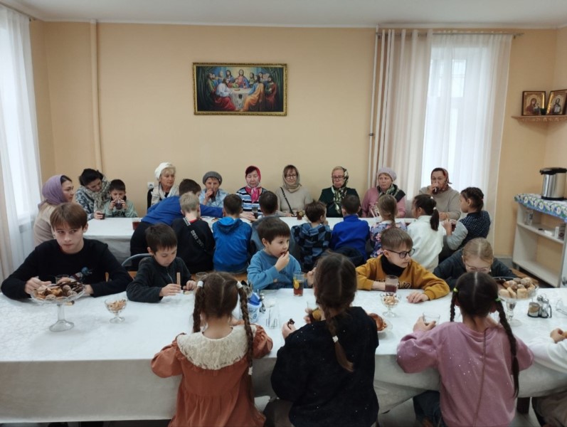 После была небольшая трапеза, где взрослые и дети наслаждались беседой, сладостями и пили вкуснейший чай из трав, которые летом собирают и сушат прихожане храма.