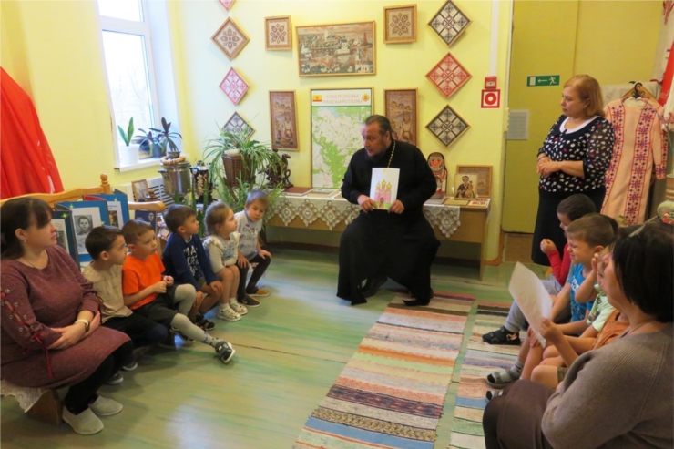 В краеведческом музее детского сада «Рябинка» (МАДОУ «ЦРР д/с «Рябинка») прошла встреча воспитанников группы «Смешарики» с настоятелем храма Казанской иконы Божией Матери г. Мариинский Посад протоиереем Георгием Черашкиным.
